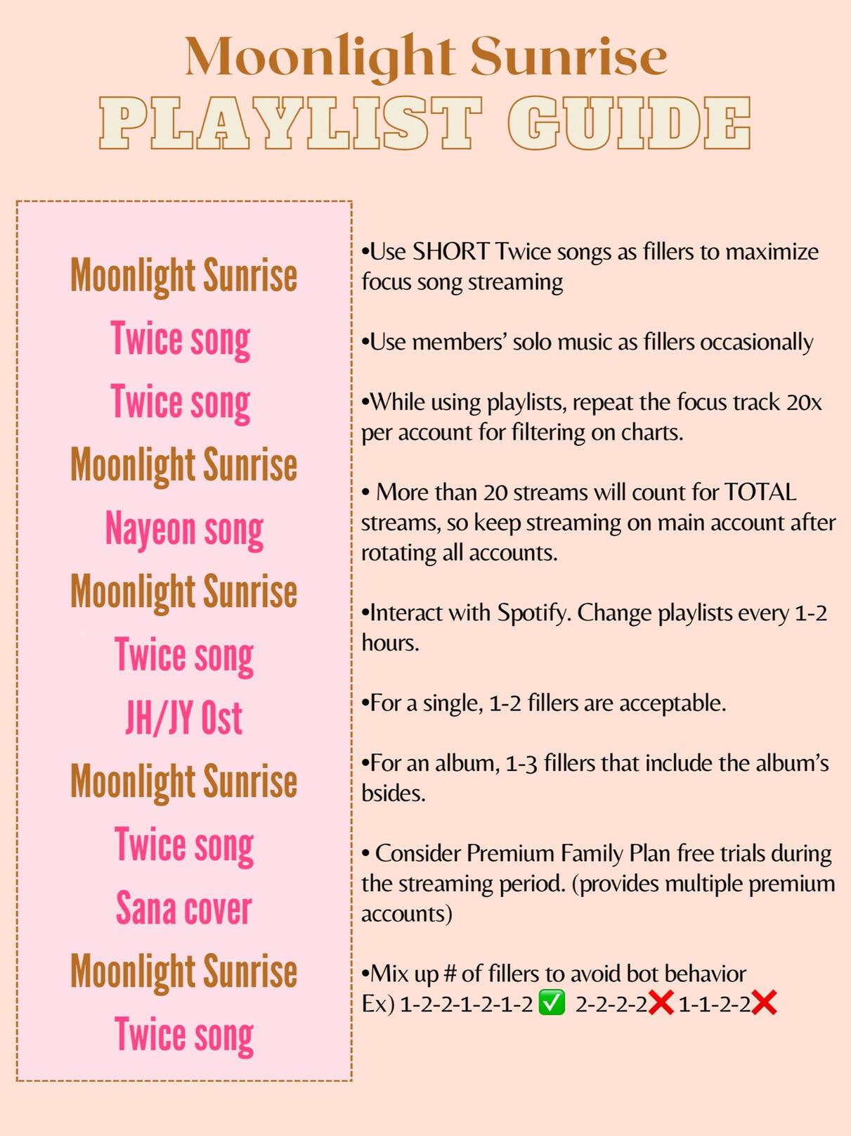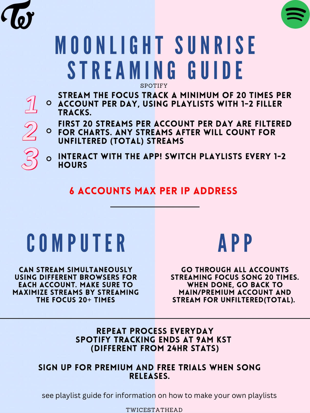 songs to avoid bot like behavior. (in simple words try to interact with spotify every 1 to 2 hour.)● if you want, you can make/use all TWICE songs focused playlists.● If possible do not play recently released other artists songs or trending songs as it may hinder twice songs to chart. (this point is for every streaming app, like youtube, apple music etc not just spotify)● make sure to like Moonlight Sunrise song, after its release.